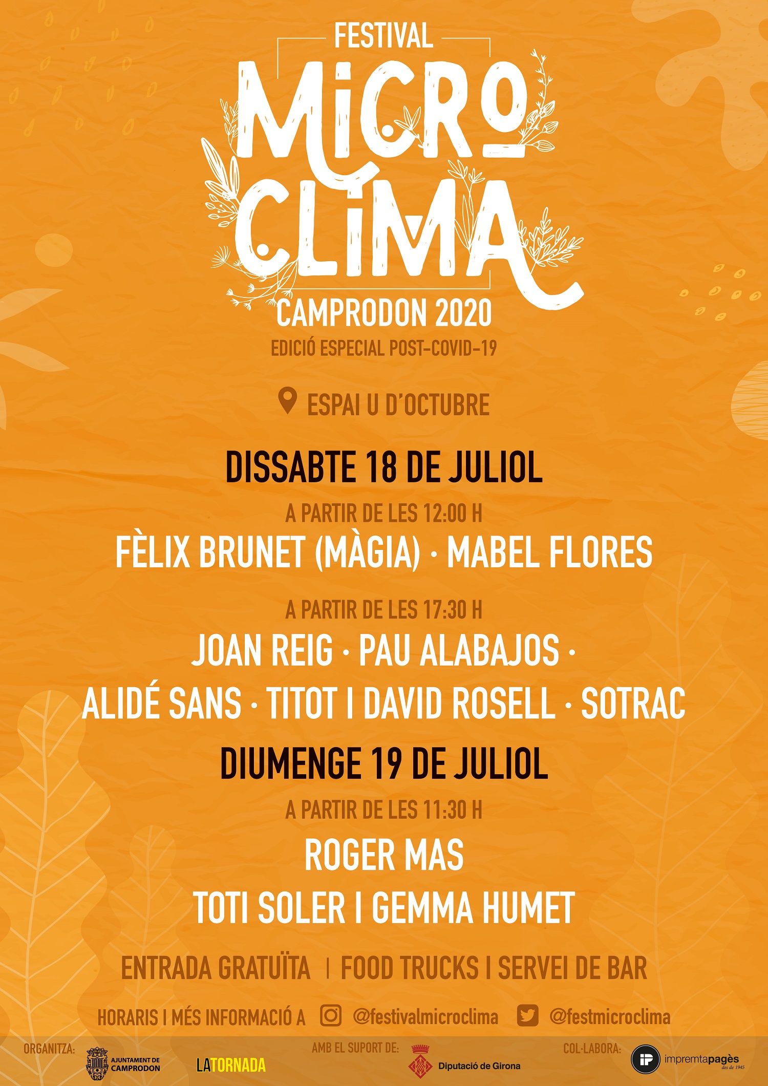 La tercera edició del festival Microclima concentrarà tota la programació en només dos dies i en un únic espai, -l’esplanada U d’Octubre, davant de l’emblemàtic Pont Nou de Camprodon-. El nou format mantindrà l’essència acústica i de proximitat del festival, amb la cançó d’autor com a pal de paller de la programació i artistes de llarga trajectòria convivint amb les veus emergents amb més projecció del moment.