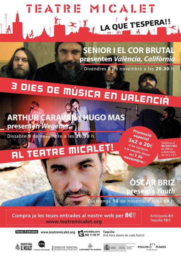 Aprofita la promoció especial 3×2, és a dir 3 concerts per 20 €, si compres les teues entrades abans del 3 de novembre. Esta promoció només es pot adquirir comprant a taquilla (horari: dijous i divendres de 19.30 a 20.30, dissabtes i diumenges de 18 a 19h).