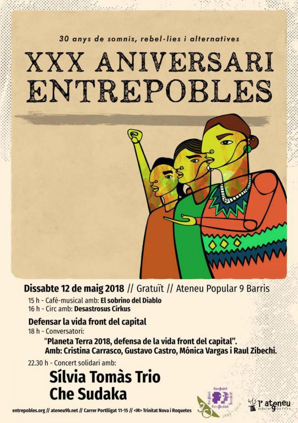 30 anys de somnis, rebel·lies i alternatives. XXX Aniversari EntrePobles. 15h: Cafè-musical amb El Sobrino del Diablo / 16h: Circ amb Desastrosus Cirkus / 18h: PLaneta Terra 2018, defensa de la vida front del capital (amb Cristina Carrasco, Gustavo Castro, Mónica Vargas i Raul Zibechi) / 22.30h: Concert solidari amb Sílvia Tomàs Trio i Che Sudaka