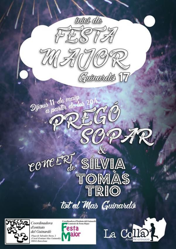 El dijous 11, en format Trio, concert a la Festa Major del Guinardó, al casal d’entitats Mas Guinardó (plaça Salvador Riera, 2), a Barcelona. A les 20h hi ha el pregó de la festa i el sopar, després el concert.