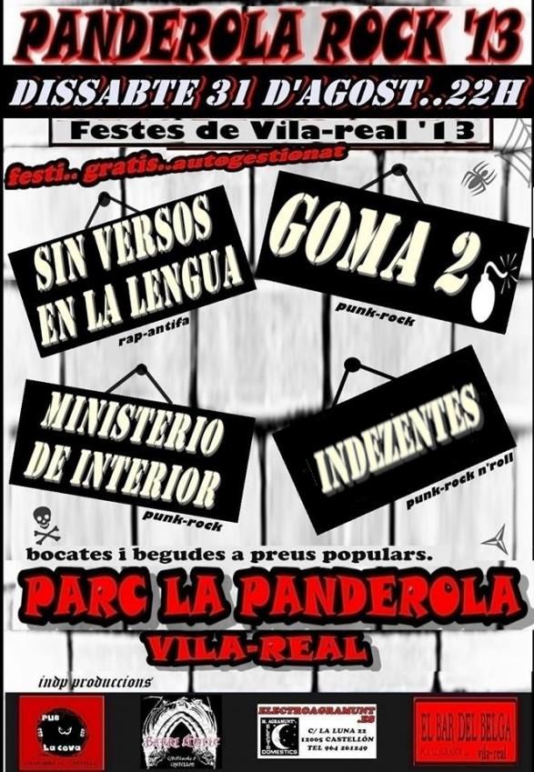 PANDEROLA ROCK festival gratuit a les festes de Vila-real .. en la volta als escenaris de la mitica banda punk dels '90 , GOMA 2 ,tambe estaran ..SVL +MINISTERIO DE INTERIOR + INDEZENTES.