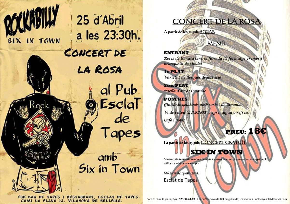 1r sopar - concert de la temporada amb SIX IN TOWN, aquesta banda osonenca farà sonar el rockabilly de sempre i els nous temes propis inclosos en el seu darrer treball discogràfic. El millor rockabilly en estat pur a l'Esclat de Tapes