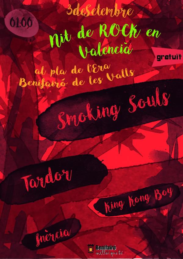 Benifairó de les Valls celebrarà -el pròxim 3 de setembre- una nova edició de la Nit de rock en valencià. Smoking Souls, Tardor, King Kong Boy i Inèrcia seran el grups convidats per completar la programació de les festes patronals de la localitat situada a la comarca del Camp de Morvedre.