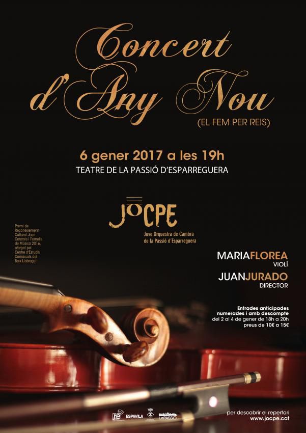 Per tercer any consecutiu, la JOCPE oferirà un gran repertori de valsos, polques, marxes i nadales ideals per donar la benvinguda al 2017! Un Concert d’Any Nou (que farem per Reis), consolidant una tradició esparreguerina: la d’associar la tarda del 6 de gener a la música orquestral. En aquesta ocasió comptarem amb la participació de la violinista solista Maria Florea! Parem bé les orelles i que comenci l’espectacle. Venda d'entrades anticipades, numerades i amb descompte a les taquilles del Teatre de La Passió del 2 al 4 de gener de 18h a 20h. Més informació a www.jocpe.cat