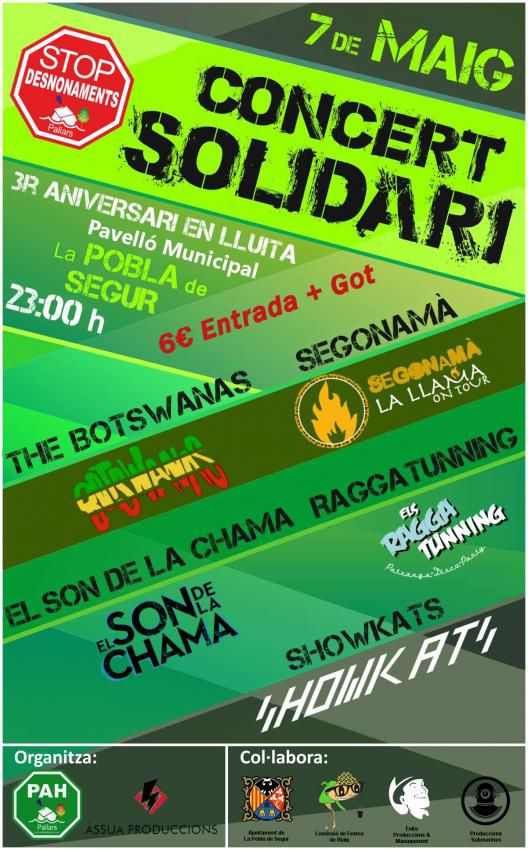 El dia 7 de maig al Poliesportiu de La Pobla de Segur es celebra el 3r aniversari de la PAH Pallars, per amenitzar aquest aniversari gaudirem de les actuacions en directe dels fabulosos grups: The Botswanas Segonamà El Son de la Chama Raggatunning i Showkats