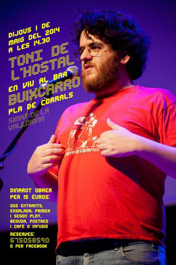 El primer dia de maig, quan la classe treballadora no descansa sinó que ix al carrer a reivindicar la seua existència, el bar Buixcarró i Toni de l'Hostal faran guàrdia per a que no se'ns menge la sompor: hi haurà un dinarot de germanor i, en acabant, el recital esperonador del company de l'Alcúdia: visca el braç treballador!