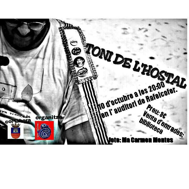 Toni de l'Hostal torna a Rafelcofer, més prop de l'Alcudiola i del trinquet que l'últim viatge, per a oferir un recital de cançó apitxada als jóvens coferers i a tot el que pague els tres eurets d'entrada, siga cabut, llepó, pixaví o altres paragentilicis que no para bé dir ara i ací. Però no patiu, que eixe dia els dirà.