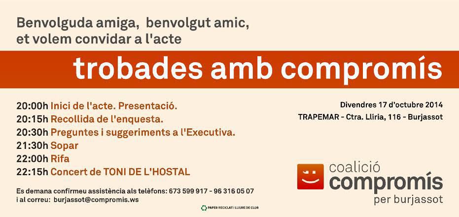 L'agrupació local de Compromís per Burjassot tancarà l'encontre amb afiliats i simpatitzants del partit amb un sopar, la rifa d'un socarrat i un recital de Toni de l'Hostal, l'únic cantant valencià que no ha musicat res d'Estellés.