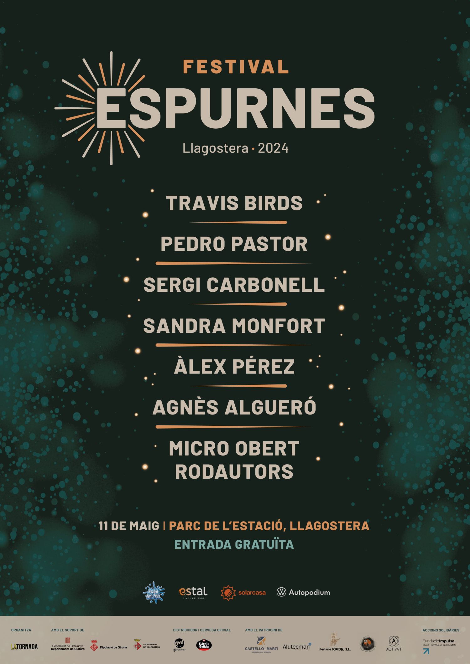 El Festival Espurnes celebrarà la seva setena edició el dissabte 11 de maig i ho farà amb un dia ple de concerts gratuïts al Parc de l'Estació de Llagostera des de primera hora de la tarda fins passada la mitjanit. Un espai per a tots els públics on passar el dia amb el millor ambient possible, gaudir dels teus artistes preferits o descobrir nova música! A més, aquest any hi afegim una programació off amb una dotzena d'activitats fora del dia del festival, entre les quals hi tindrem xerrades, tallers, concerts i molt més!