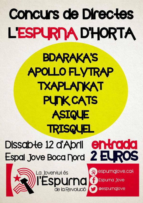 Aquest any engeguem el projecte de la "Festa de la Joventut" com una nou moviment. El moviment de "L'Espurna", que sota el lema "La Joventut som l'Espurna de la Revolució" encara un any de feina als carrers i feina entre nosaltres per tal de construir un nou projecte, una nova Joventut Comunista a Catalunya. En aquest context el 28 de Juny celebrarem la "Festa de la Joventut", antiga "Festa Revolució" i comptarem amb els grups: Chikos del Maíz, Los Barrankillos i AlQuadrat. A més a més, donarem la opció de tocar amb aquests grups al guanyador del concurs de directes "L'Espurna".