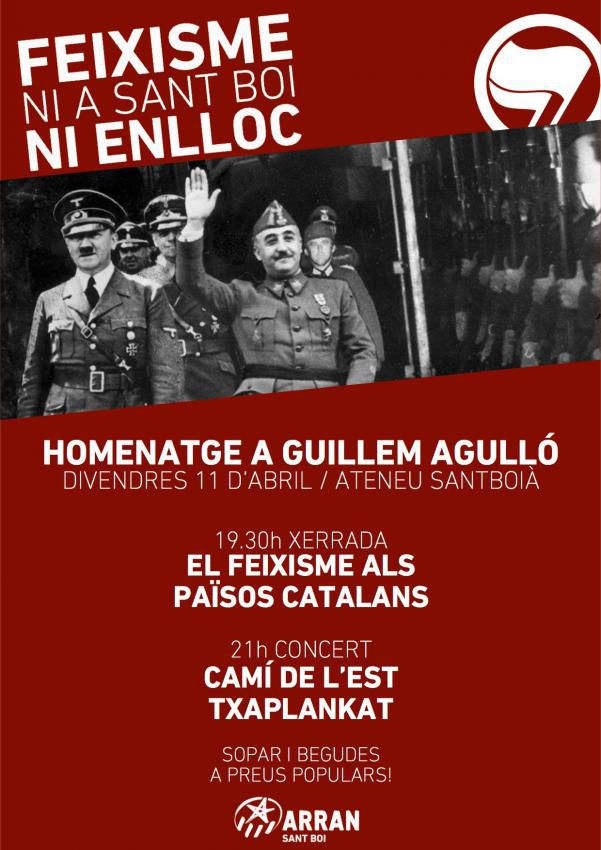 En el marc de la campanya antifeixista d'Arran Sant Boi i coincidint amb el 21è aniversari de l'assassinat de Guillem Agulló, el proper divendres 11 d'abril organitzem una xerrada sobre el feixisme als Països Catalans i un concert amb Camí de l'Est i Txaplankat.
