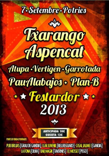Enguany tot segueix caminant i torna el FESTARDOR amb més força que mai al nostre País Valencià. El concert serà a Potries (La Safor) , al poliesportiu municipal, el dissabte 7 de Setembre, amb els grups Txarango, Aspencat, Atupa, Vertigen, Garrotada, Pau Alabajos i Martin Plan-B