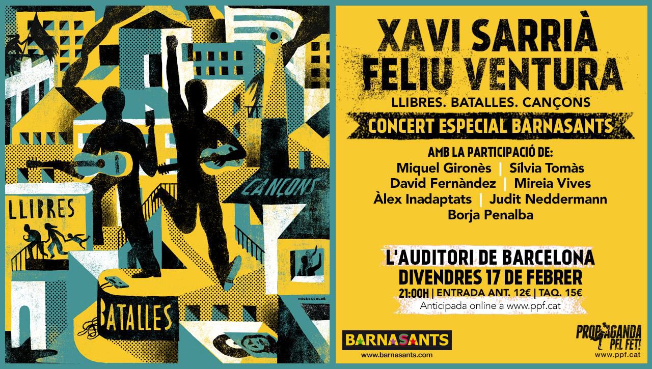 Res és per a sempre, ni tan sols les estrelles al firmament, i durant els primers mesos de 2017 veurem la darrera remesa de concerts de ‘Llibres. Batalles. Cançons’. Abans de dir adéu, i ja sabeu que no es pot dir adéu massa fort, Xavi Sarrià i Feliu Ventura no han volgut deixar escapar l’oportunitat de participar al Barnasants i de fer-ho amb una versió de ‘Llibres. Batalles. Cançons’ amb memòria, compromís, record, experiència, ferida i esperança compartida i augmentada. L’Auditori de Barcelona acollirà el divendres 17 de febrer i amb caràcter extraordinari una nit única amb la participació d’amics, artistes i companyes que compartiran escenari, llibres, batalles i cançons amb Feliu i Xavi: s’apunten a la festa grossa Miquel Gironès, Sílvia Tomàs, David Fernàndez, Mireia Vives, Àlex Inadaptats, Judit Neddermann i Borja Penalba.