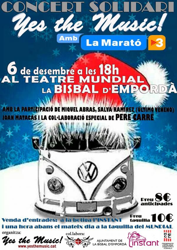 Aquest any us proposem gaudir d’un concert molt especial: Yes The Music! es compromet amb la Marató de TV3 2016, que enguany està dedicada a l’ictus i les lesions medul·lars i cerebrals traumàtiques, destinant tots els beneficis del concert de Nadal d’aquest any a aquesta causa.