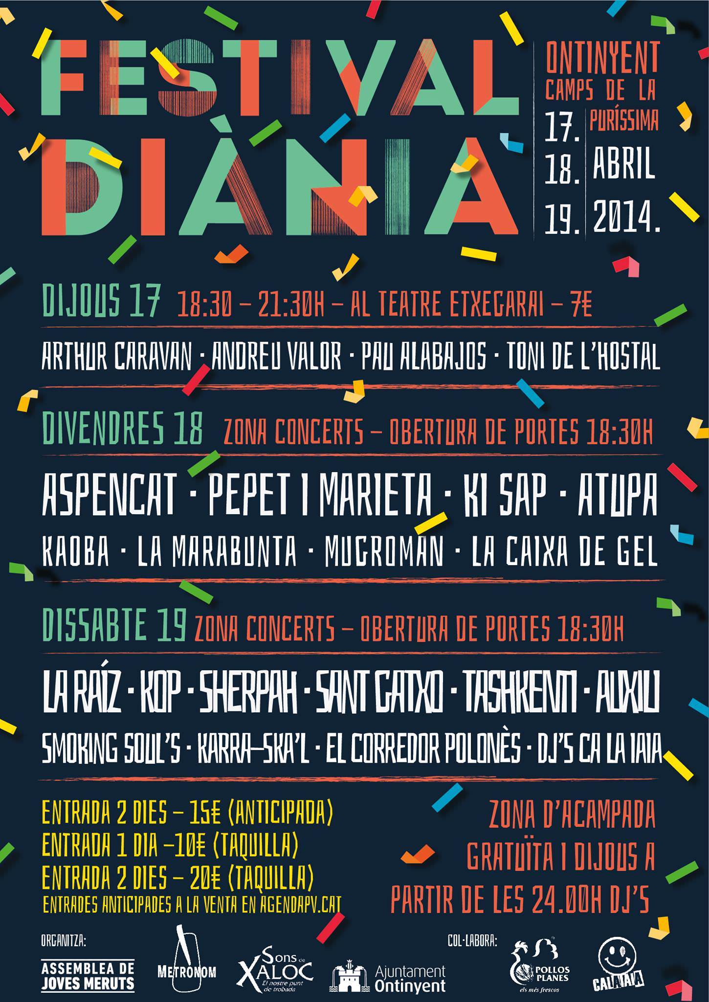 El proper dissabte 5 d’abril tinrà lloc a partir de les 19h la Festa de presentació del Festival Diània a Ca la Mera, Ontinyent. A la festa es sortejaran 3 abonaments per al festival i hi haurà performance a càrrec del grup Histèria Kolectiva. A la nit hi haurà punxadiscos des de Bocairent amb el seu col.lectiu de dj’s Sistema de Só Faraònic. Un dia abans tindrà lloc la roda de premsa per presentar el festival als mitjans de comunicació. Així, el dissabte tindrà lloc la primera activitat prèvia al Festival Diània. Un festival que té previst començar el proper 17 d’abril i perllongar-se fins el dia 19. Tres dies de concerts amb una bona representació de les millors bandes valencianes i locals.El dijous dia 17 hi tindran lloc al Teatre Etxegarai les actuacions dels cantautors Pau Alabajos, Andreu Valor i Toni de l’Hostal, a més de la banda alcoiana Arthur Caravan. El dissabte 18 hi podrem gaudir dels concerts d’Aspencat, Pepet i Marieta, Ki Sap, Atupa i algunes bandes més. El colofó arribarà el dissabte 19 d’abril amb els directes de La Raíz, Sherpah, Sant Gatxo, Tashkenti, Auxili, Smoking Soul’s i més.