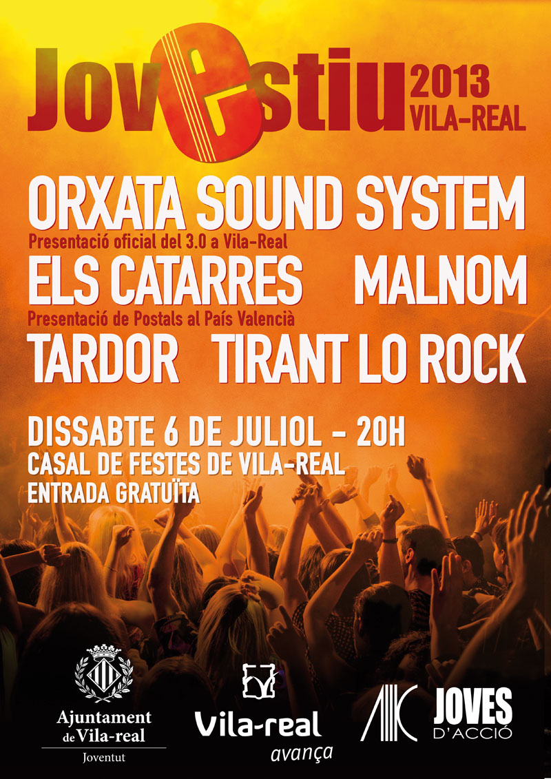 El concert, que compta amb la col·laboració de l?Ajuntament de Vila-Real a través de la seua regidoria de joventut, seguirà el tradicional esquema del festival de combinar grups de primera línia amb grups novells, en aquest sentit a l?edició d?enguany actuaran l?omnipresent grup de l?Horta Orxata Sound System que presentarà el nou disc 3.0 a Vila-Real i el grup revelació català Els Catarres, que no deixa ningú indiferent des del seu tema ?Jennifer? i que presentarà al Jovestiu el seu nou disc ?Postals? al País Valencià.Els encarregats d?obrir la nit però, seran Tardor (guanyadors de l?última edició del concurs Amplifica?t) i els grups de la comarca Malnom (segons en l?edició de l?Amplificat del 2011) i Tirant lo Rock guanyadors entre d?altres del conegut concurs de la comarca Rock Penat.