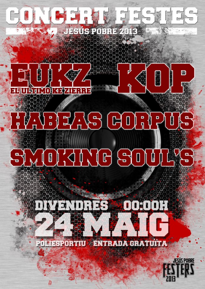 El proper Divendres 24 de Maig a Jesús Pobre -a La Marina Alta- i emmarcat en les seues festes patronals, podrem gaudir de les actuacions de El Último Ke Zierre, Kop, Habeas Corpus i Smoking Soul's.