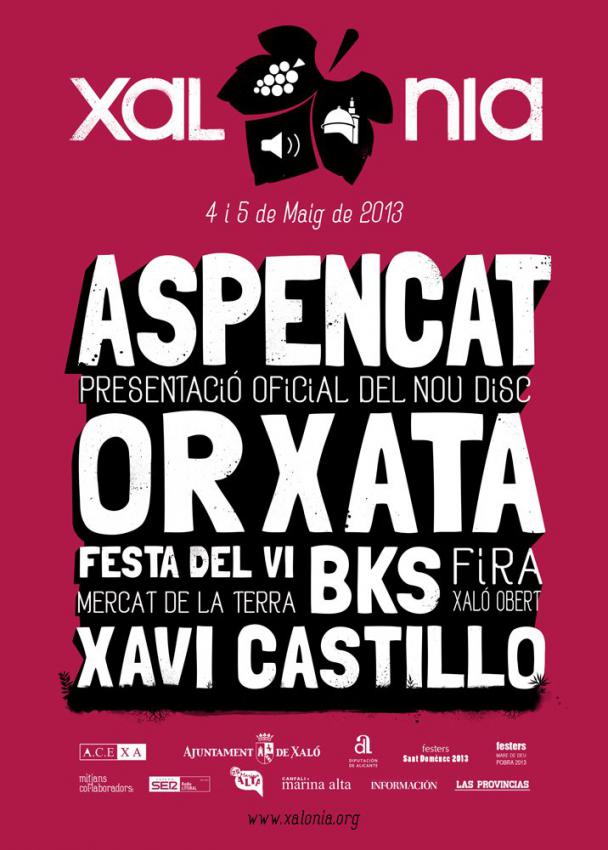 Enguany es gaudirà de tres grups de música en valencià. Aspencat, naturals de Xaló, i els valencians Orxata Sound System i BKS. Aspencat arriba al seu poble un any més només cinc dies d'haver estrenat el seu últim treball Essència, on esperaran la resposta de la seua gent davant aquest gir realitzat en la seua música. Oraxata i BKS també han vullgut enguany unir-se a la festa del Xalònia, acompanyant als veterans d'aquest festival, ja que Aspencat ha participat en totes les edicions d'aquest. D'ells tres es gaudirà el proper dissabte dia 4 de maig, a partir de les 23:00h on tancarà la sessió el DJ Carlos Puig.El diumenge dia 5, abans de la cloenda de Xalònia, Xavi Castillo exhibirà un dels seus shows al poliesportiu de Xaló (20:00h). Ací podeu veure tots els punts de venda de les entrades i la compra online. Vos deixem el video de presentació del Xalónia 2013.