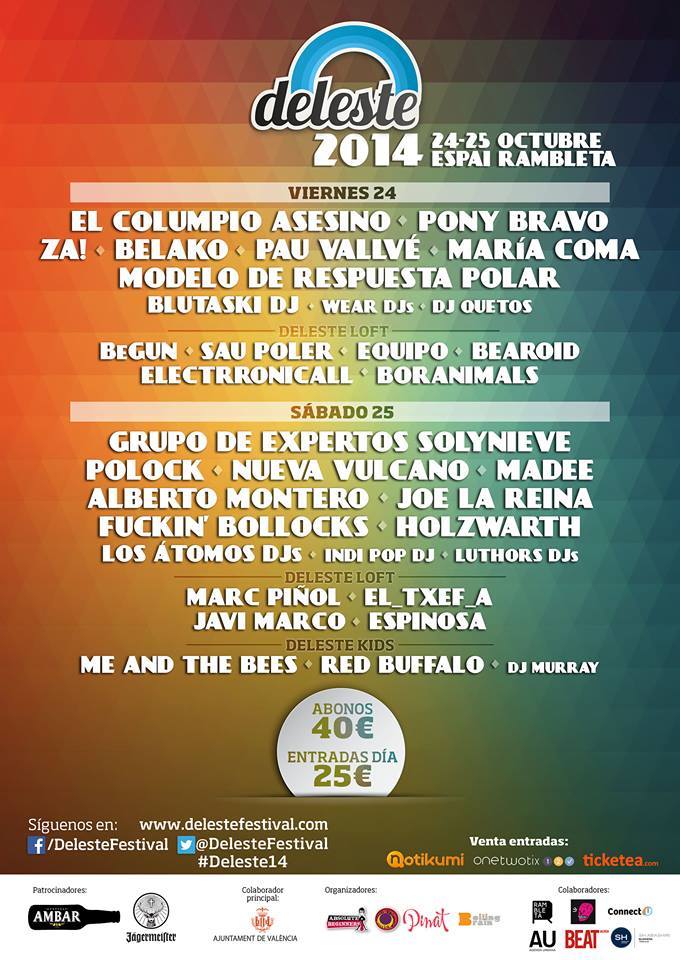 En una semana començarà el festival de la tardor per exel·lència a la ciutat de València. Es tracta del Deleste Festival. Fa només unes setmanes el Qfestival d’Alzira ja ens va servir de precedent per obrir una nova seguida de concerts “d’hivern”, deixant enrere un estiu amb festivals a la vora del mar. Així, La Rambleta serà l’encarregada d’acollir per tercer any consecutiu el Deleste, un festival que compta amb un cartell força diferenciat dels clàssics festivals estiuencs. Aquest any encapçalaran el cartell Grupo de Expertos Solynieve i El Columpio Asesino. A més actuaran Pony Bravo, els valencians Polock presentant el seu Rising up, Nueva Vulcano, Madee, els catalans Pau Vallvé i Maria Coma, Modelo de Respuesta Polar, Za! i Red Buffalo, entre d’altres. En aquesta tercera edició, l’electrònica cobrarà més presencia de la mà de Marc Piñol i Begun.Pel Deleste ja han passat artistas com Fanfarlo, Nudozurdo, Julio de la Rosa, Guadalupe Plata o Mujeres. Un festival que sens dubte és dels més vanguardistes de la ciutat de València, bé siga pels espais tan diàfans que possibilita la Rambleta o bé per la qualitat musical que la cita destila. Així mateix, enguany també es comptarà amb la sexta planta que fou recentment inaugurada, un lloc que ens trasllada al Berlin més estimat.